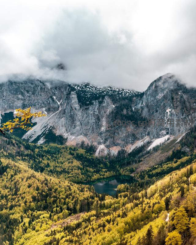 层峦叠嶂间云雾弥漫,山脚湖泊静卧,四周森林染上金黄秋色,构成一幅壮丽而宁静的自然画卷,令人心旷神怡。