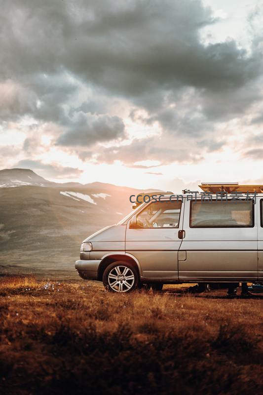 一辆银色露营车停驻在开阔的山野草地上,背景是连绵起伏的雪山与绚烂的晚霞,营造出宁静而自由的旅行氛围。
