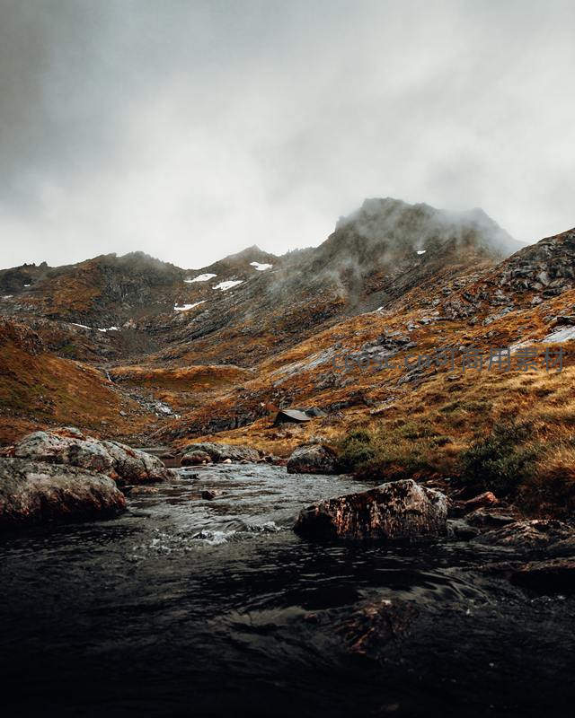 一条清澈的溪流蜿蜒穿过布满岩石的山谷,远处山峰隐于薄雾之中,秋色染黄的山坡与冷色调水面形成静谧对比。
