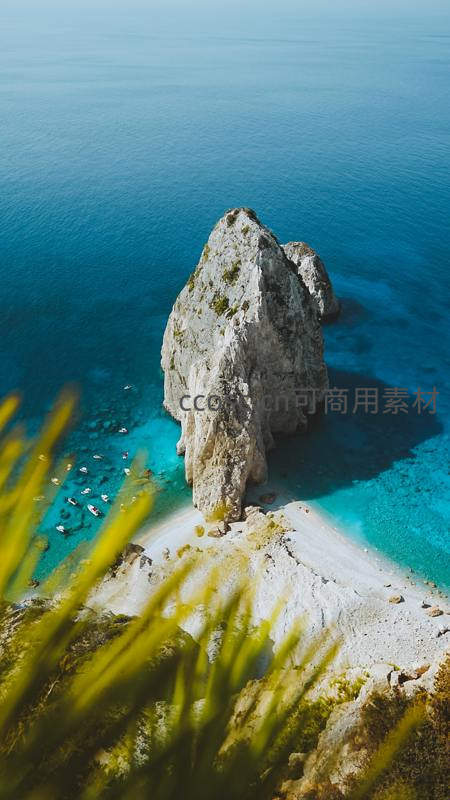 从高处俯瞰,一座巨大岩石矗立于湛蓝海水中央,洁白沙滩环绕,几艘小船停泊岸边,构成一幅绝美海岛画卷。
