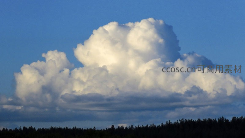 蔚蓝天空下,巨大的白色积雨云如棉花糖般蓬松,下方是深色的森林剪影,构成壮丽的自然画卷。