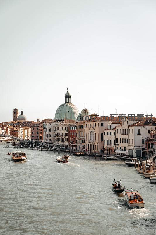 阳光下威尼斯大运河波光粼粼,贡多拉与汽船穿行于彩色老楼之间,标志性穹顶教堂矗立远方,尽显水城风情。
