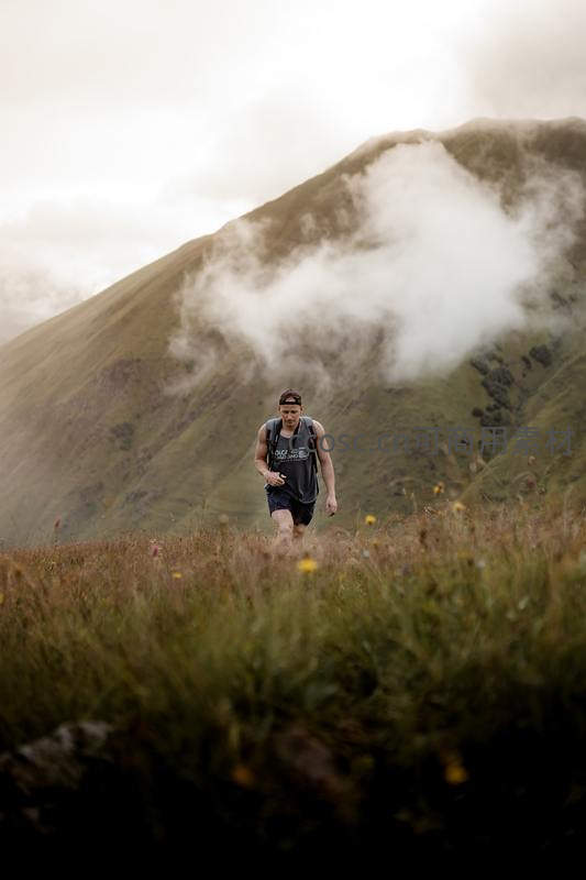 一名身着运动装备的男子在云雾缭绕的山坡草地上奋力奔跑,背景是雄伟的山脉,展现了人与自然搏斗、追求极限的运动精神。