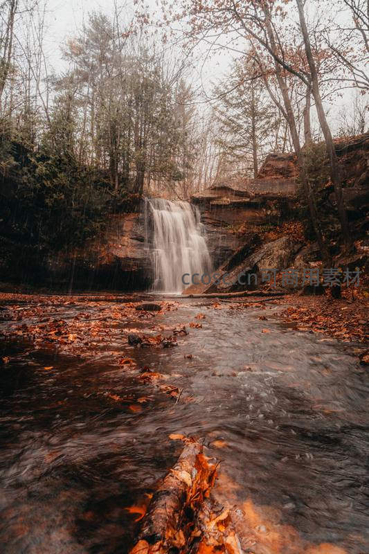 在萧瑟的秋日森林里,一道清泉从岩壁上倾泻而下形成小瀑布,汇入布满金黄落叶的溪流中,营造出静谧、诗意且充满季节感的自然画卷。