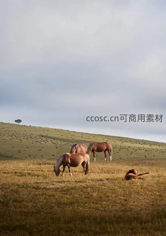 几匹骏马在辽阔的草地上或低头吃草,或卧地休憩,远处孤树点缀,天空云层低垂,勾勒出一幅宁静祥和的田园牧歌图景。