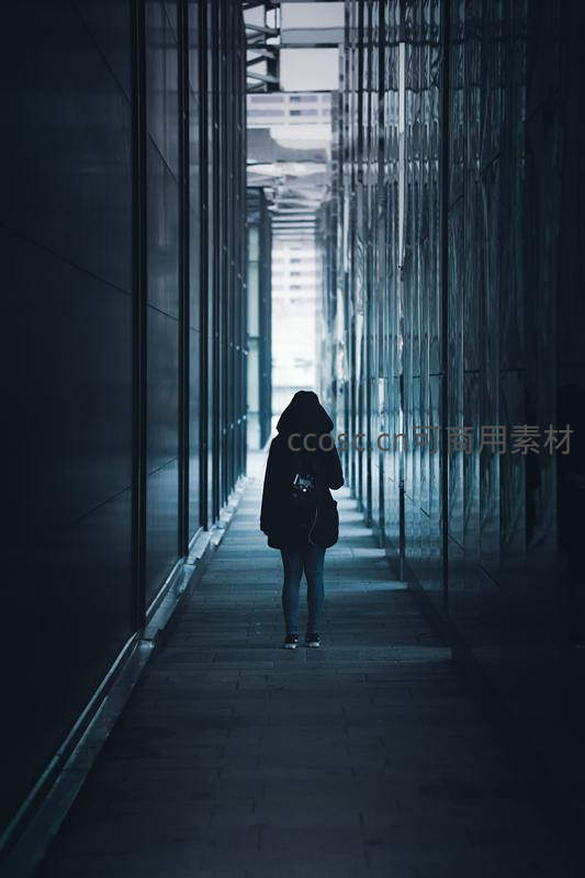 一位穿着连帽外套的人走在现代建筑的玻璃长廊中,两侧镜面反射形成纵深感,整体蓝调氛围渲染出都市中的疏离与沉思。