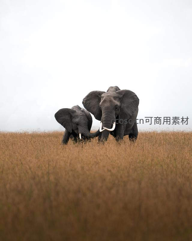 在广袤的金色草原上,一头成年大象与幼象亲密依偎,用长鼻温柔触碰,展现出自然界中动人的亲子情感。