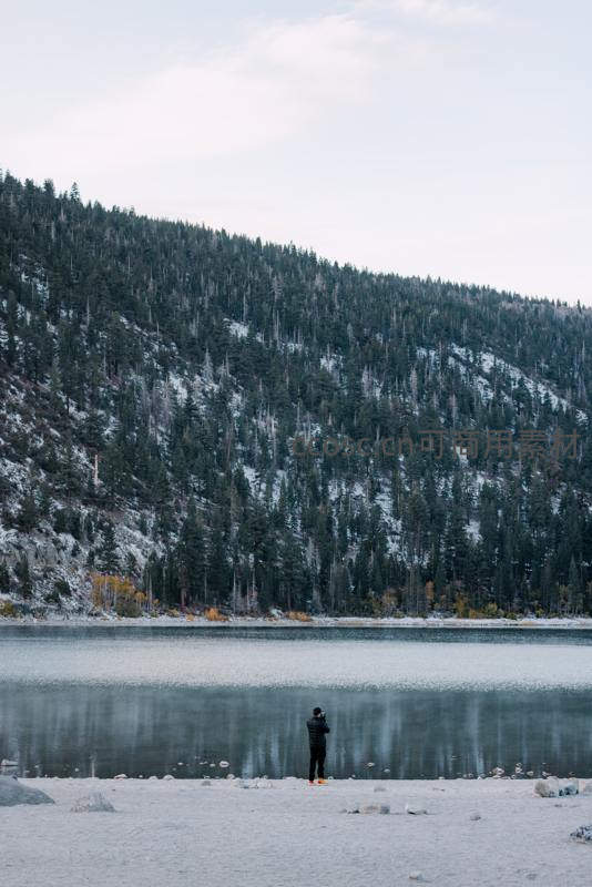 白雪覆盖的湖岸,一人独立远望,身后是苍翠松林与薄雪点缀的山峰,天地间一片静谧空灵之感。