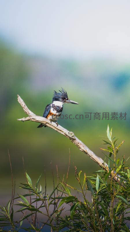 一只冠鱼狗立于枯枝之上,羽冠挺立,目光如炬,背景绿意朦胧,尽显湿地生态中的灵动与警觉。