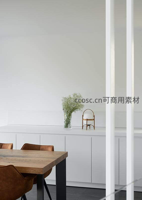 明亮通透的现代家居空间,原木餐桌搭配棕色皮质餐椅,背景是纯白橱柜与一束清新绿植,整体风格简约而温馨,营造舒适用餐氛围。