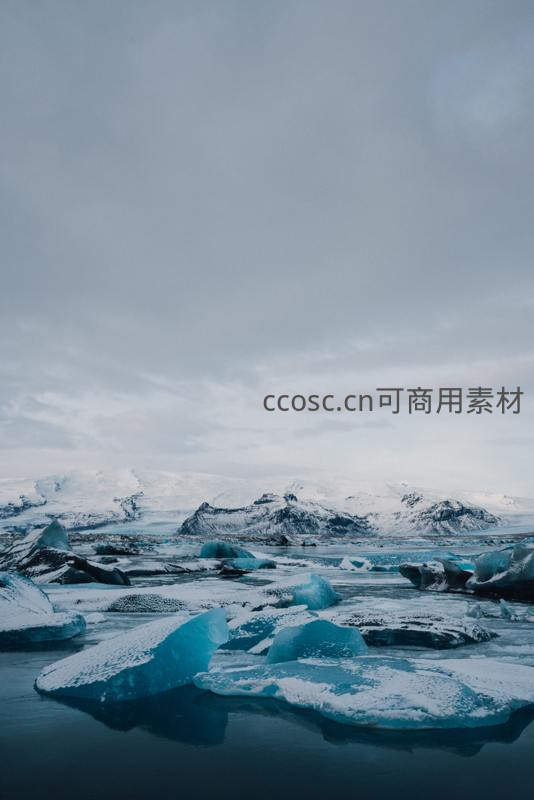 灰蒙天空下,幽蓝的冰块散落在平静的湖面上,远处是白雪覆盖的山脉,构成一幅冷峻而壮丽的极地自然画卷。