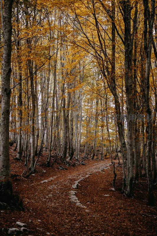 一条蜿蜒的小径穿过一片金黄色的树林,白桦树干挺拔,地上厚厚的落叶如同地毯,整个画面充满了秋日的温暖与静谧。