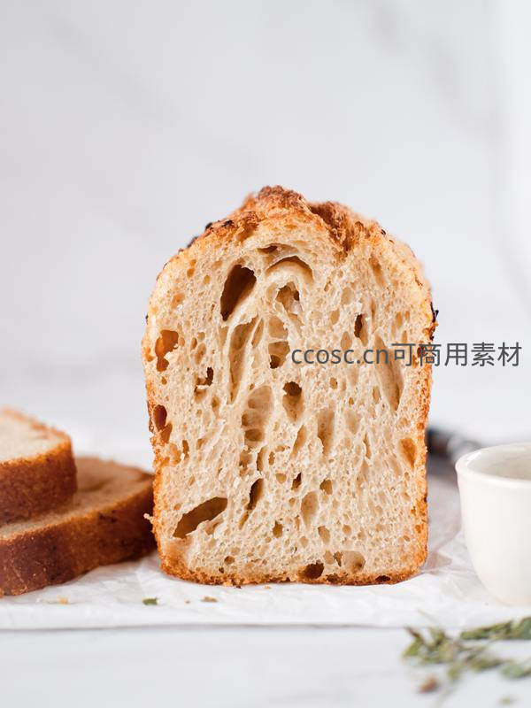 新鲜出炉的手工面包切面展示出均匀大气孔结构,外皮酥脆内里柔软,搭配香草与白瓷杯,传递质朴美味的烘焙艺术。