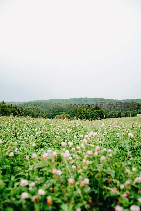 一片繁茂的花田在微风中摇曳,粉白花朵点缀翠绿草丛,远处连绵青山笼罩薄雾,构成一幅静谧诗意的田园画卷。