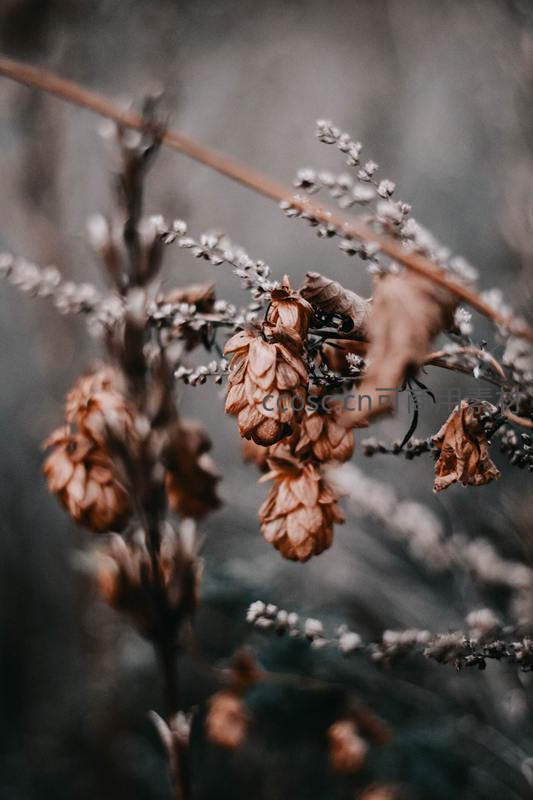 微距镜头下,干枯的啤酒花穗垂挂枝头,棕褐色花瓣层层叠叠,背景虚化突出质感,传递出季节更替的萧瑟美感。
