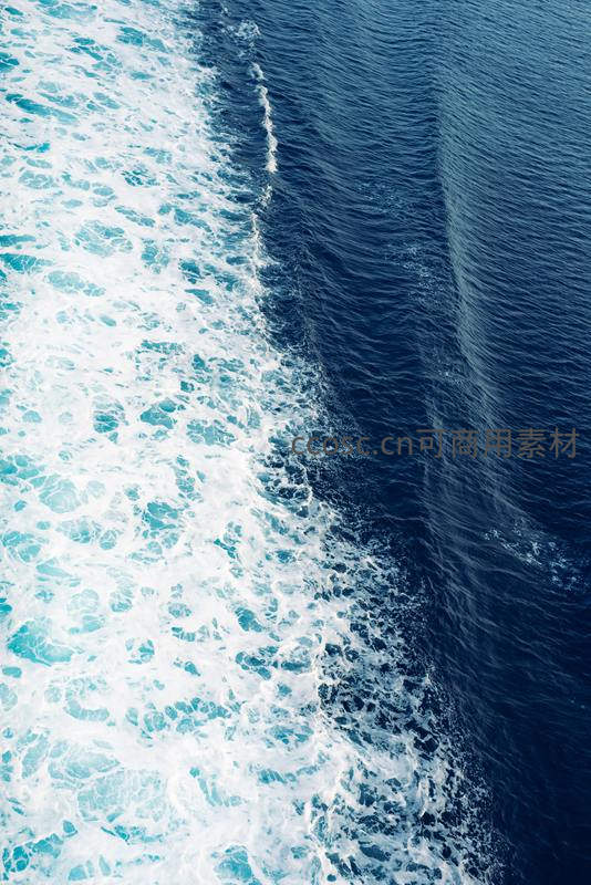 从高空视角捕捉船只航行后留下的白色浪花轨迹,与深邃蔚蓝海水形成鲜明对比,象征着探索与无垠的自由之旅。