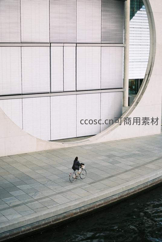 一位骑行者穿过现代建筑旁的圆形拱门,水面倒影与几何线条构成极简美学,展现城市中人与空间的诗意互动。