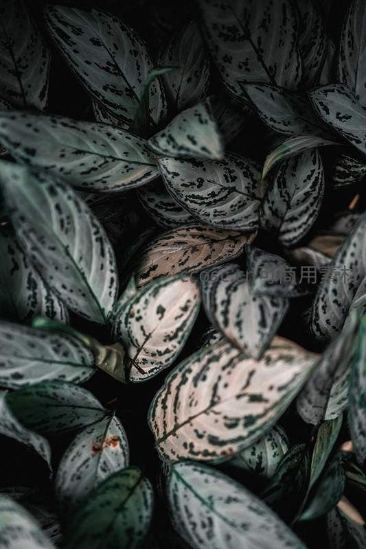 近距离捕捉植物叶片上独特的银白色斑纹与深绿底色交织的图案,在幽暗光线下呈现出如水墨画般的质感与生命力。