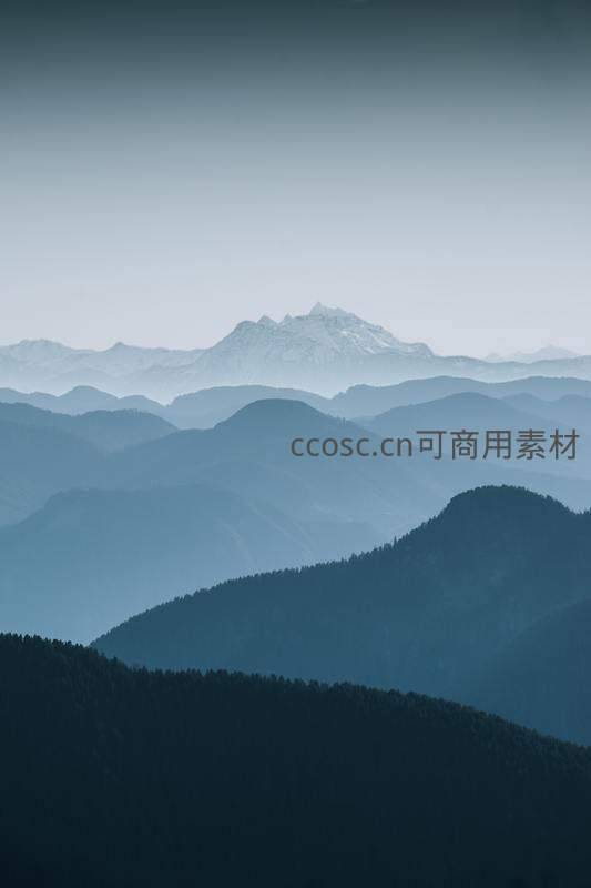 层层山峦由近及远渐隐于薄雾之中,色调由深蓝过渡至淡灰,宛如中国传统水墨画,营造出空灵悠远的诗意境界。