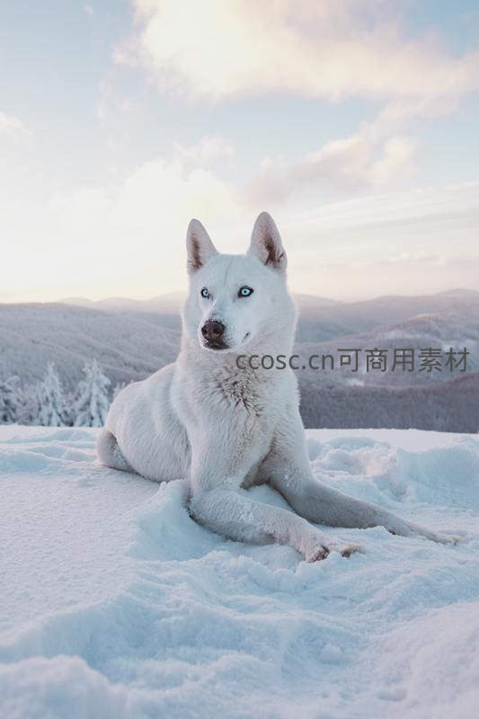 一只拥有湛蓝双眸的白色哈士奇静卧在皑皑白雪中,背景是连绵起伏的雪山与柔和晨光,尽显冬日野性之美与温柔气质。