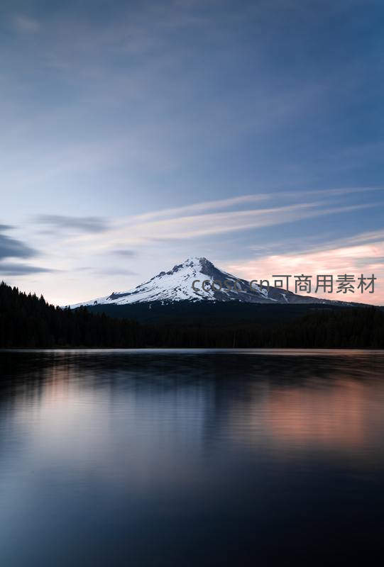 远山覆雪巍峨耸立,湖水如镜倒映峰峦与彩霞,天边云层被晨光染成粉紫,营造出宁静壮美的自然画卷,令人心旷神怡。