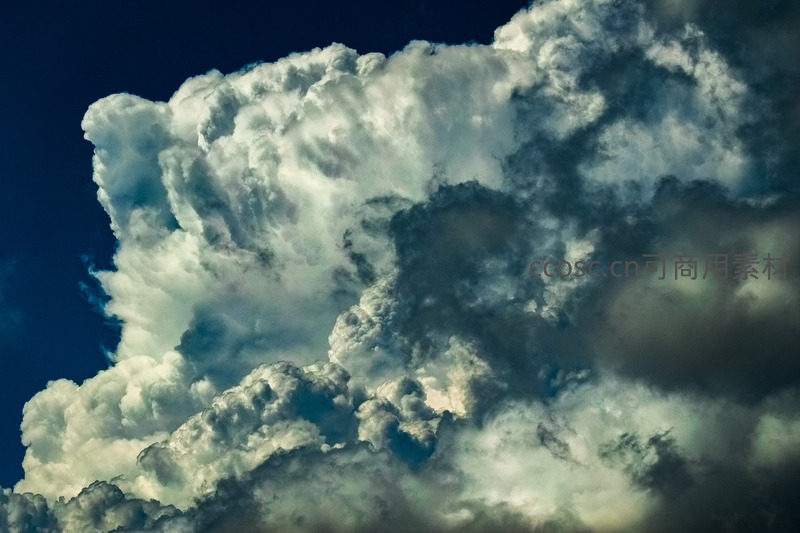 在深邃的蓝色背景下,蓬松的白色云团层层叠叠,光影塑造出立体感,展现天空的瞬息万变。