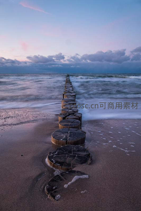 在暮色四合的海边,一排古老的木桩如路径般伸向远方,温柔的海浪轻抚沙滩,天空被染成梦幻的粉紫色,静谧而壮美。