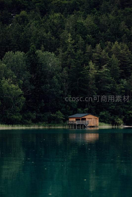 一座木质小屋静立湖畔,被茂密的深绿森林环抱,湖水如镜映照着屋宇与树影,营造出远离尘嚣的世外桃源之感。
