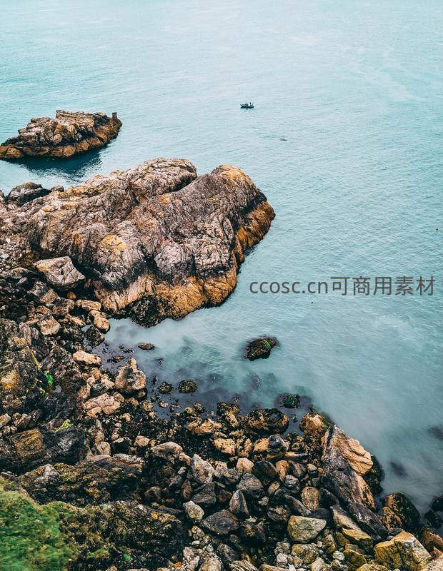 从高空俯瞰嶙峋礁石与清澈碧海交界处,一艘小船悠然漂浮其上,构成一幅宁静而壮阔的滨海自然画卷。