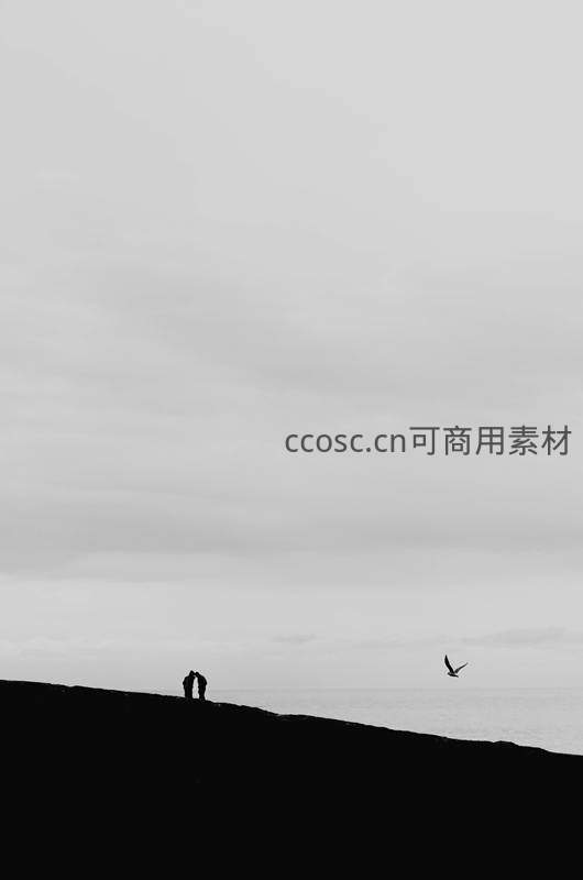 在广袤的灰白天空下,黑色海岸线上伫立着一个渺小的人影,一只飞鸟掠过,构成一幅充满诗意与孤独感的极简主义画面。