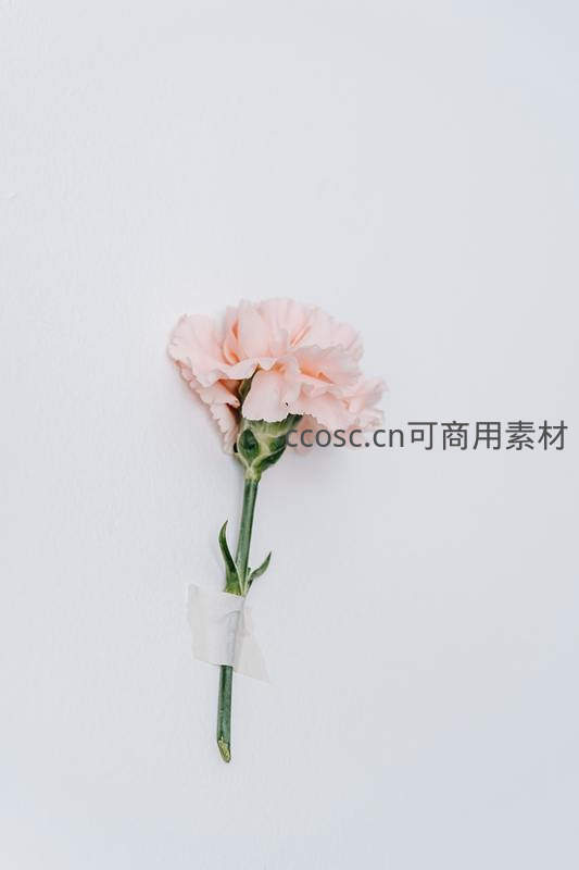 一支淡粉色康乃馨被轻柔地固定在纯白墙面上,简洁的构图突显其柔美花瓣与清新绿茎,传递出宁静而温暖的情感。