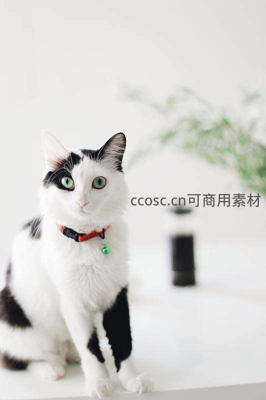 黑白相间猫咪佩戴红色项圈凝视镜头