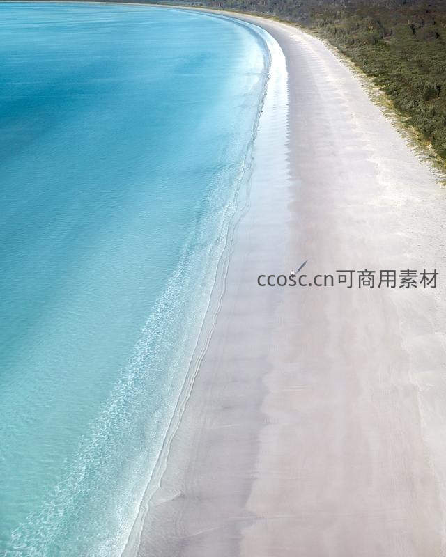从高空俯瞰,清澈碧蓝的海水与洁白细软的沙滩形成鲜明对比,一人独行于海岸线旁,尽显天地辽阔与宁静致远。