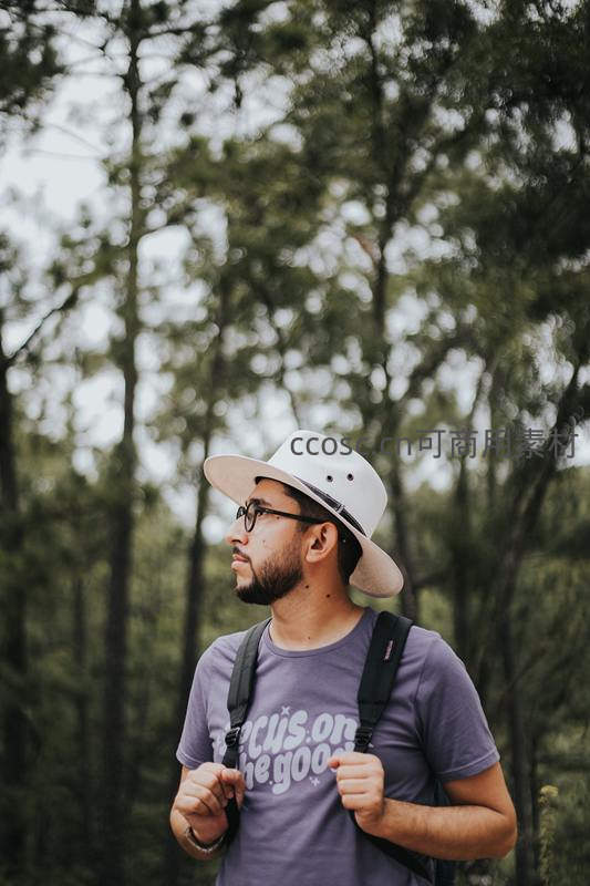 一位戴白色宽檐帽和眼镜的男子站在树林中,背着双肩包,抬头凝视远方,神情专注,背景绿意盎然,充满宁静与思索的气息。