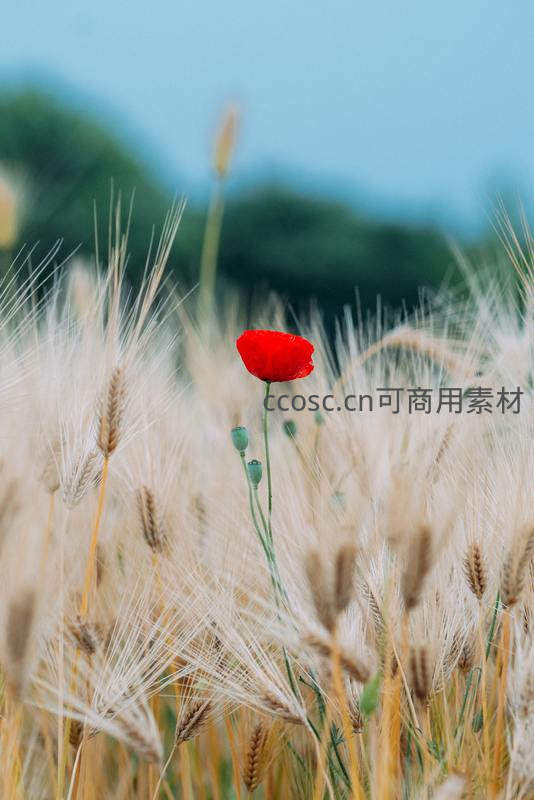 麦田中一朵红罂粟绽放