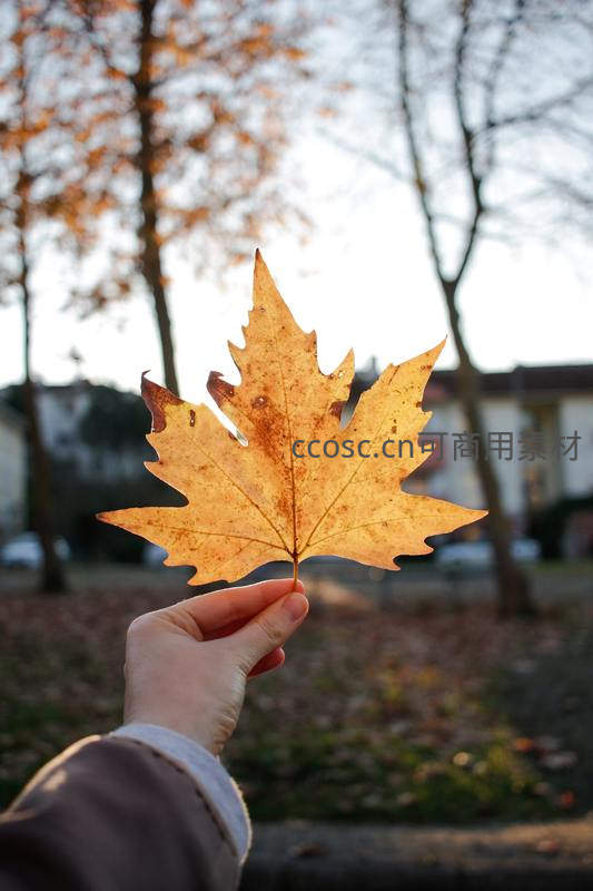 一只手轻轻托起一片金黄色的枫叶,阳光穿透叶片纹理,背景是模糊的秋日公园,温暖色调传递季节更替的诗意与静谧。