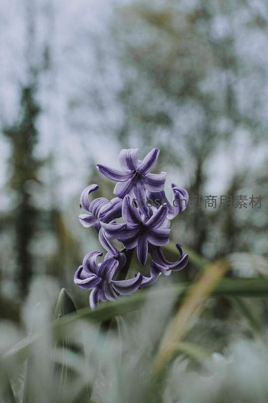 一簇精致的紫色风信子在模糊的树林背景下优雅绽放,花瓣卷曲细腻,色彩饱和而柔和,微距镜头捕捉其自然之美,传递出宁静与浪漫的气息。