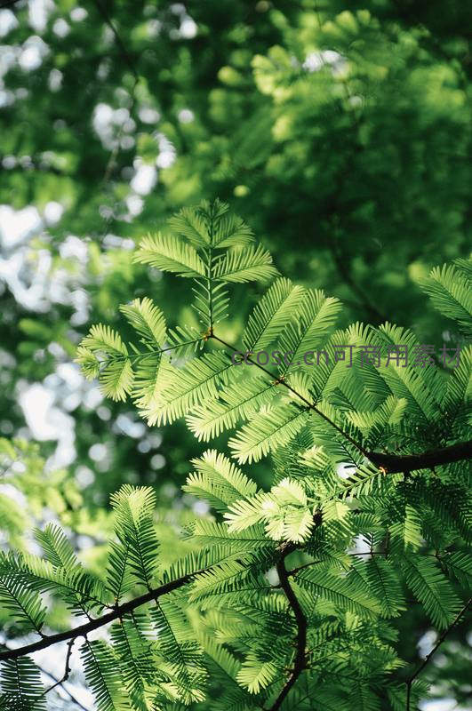 阳光透过茂密的翠绿针叶,在枝叶间洒下斑驳的光影,叶片脉络清晰,充满生命力,营造出清新宁静的森林氛围,让人感受到大自然的呼吸。