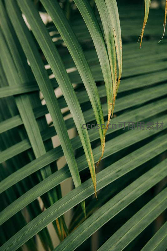 层层叠叠的棕榈叶在柔和光线下交织,部分叶片边缘略显枯黄,形成鲜明对比,展现热带植物的蓬勃生机与自然韵律。