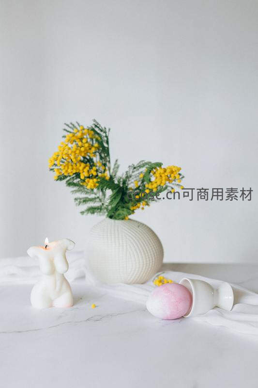 洁白纹理花瓶插着明黄小花,搭配兔子造型蜡烛与粉色浴球,整体构图简洁雅致,营造出温暖舒适的居家生活气息。