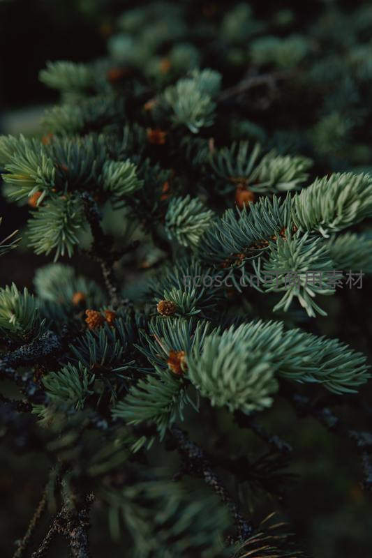近距离捕捉深绿色松针的细腻纹理与层次,枝头点缀着微小的橙色花苞,展现出森林深处植物生命的静谧与坚韧之美。