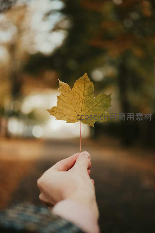 一只温暖的手轻轻托举着一片金黄的枫叶,背景是朦胧的秋日林间小径,画面充满诗意与季节更迭的温柔感怀。