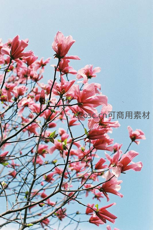 粉红色的玉兰花在湛蓝天空下盛放,花瓣舒展柔美,枝条交错,传递出浓郁的春日气息和生命蓬勃向上的活力与希望。