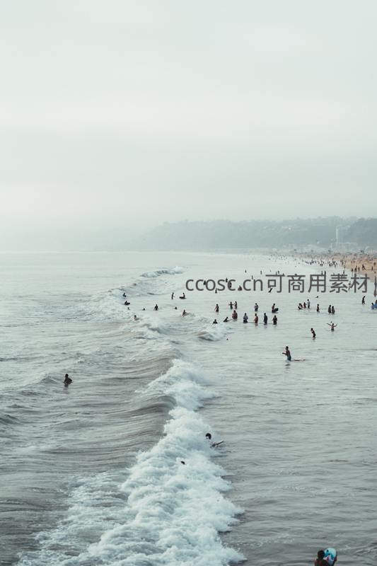 薄雾笼罩的海岸线上,众多冲浪者在起伏的波浪间穿梭,远处沙滩上人影点点,构成一幅充满动感与休闲气息的海滨画卷。