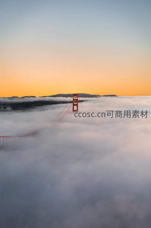在壮丽的日出时分,金门大桥的红色桥塔如巨人般刺破浓厚的云海,天空被染成温暖的橙黄色,云层如海洋般翻涌,构成一幅梦幻般的空中奇景。
