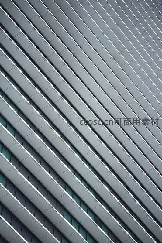 画面中,建筑外墙的金属或玻璃板以精确的斜向平行线排列,形成强烈的视觉引导和节奏感。这种重复的几何图案突出了现代建筑设计的秩序、精确与工业美学。