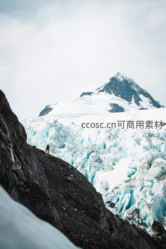 一位登山者伫立于崎岖岩坡之上,俯瞰脚下蔚蓝冰川与远处云雾缭绕的雪峰,画面传达出人类探索自然的勇气与壮丽山河的震撼。