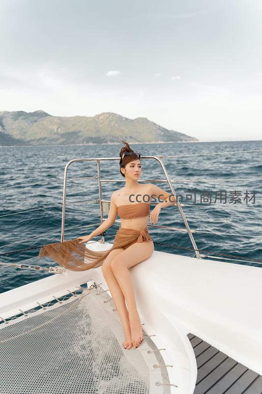 一位年轻女子身着棕色泳装坐在游艇前端,背后是辽阔碧海与远山,尽显悠闲惬意的海上度假风情。