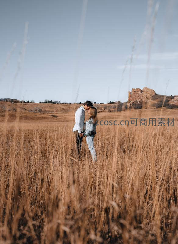 一对情侣在金黄色的秋日草地上深情相拥亲吻,背景是远山和蓝天,画面温馨浪漫,充满爱意与宁静的田园氛围。