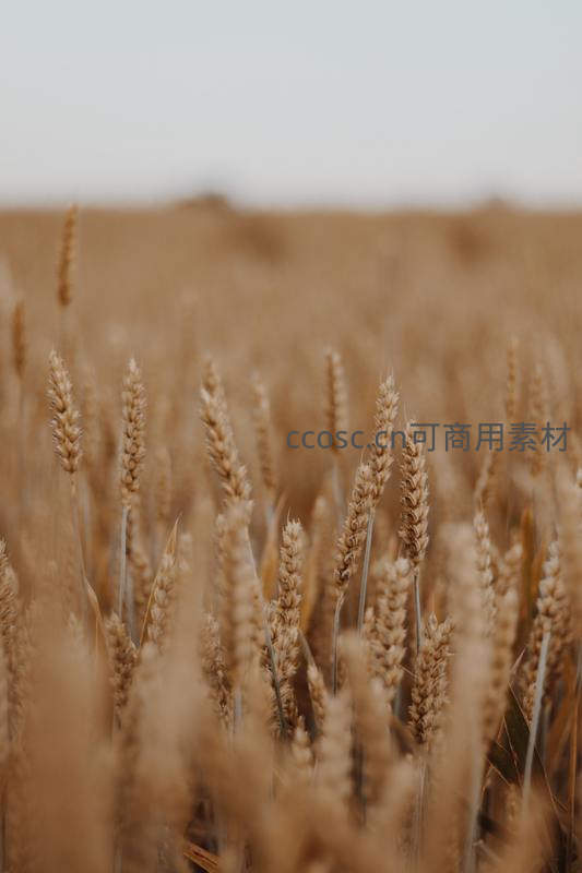 成熟的麦穗在柔和光线下泛着温暖金色,前景清晰、背景虚化,营造宁静丰收氛围,象征自然馈赠与农耕文明,适合乡村或食品类视觉设计。